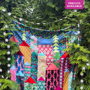The quilt design features stacked Flying Geese that transform into charming houses and pine trees, creating a joyful holiday village scene. Though the finished quilt looks wonderfully intricate, the piecing is clear and approachable—ideal for confident beginners and intermediate makers who want a show‑stopping seasonal project.